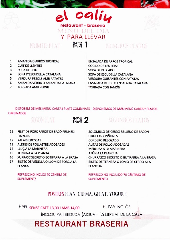 EL CALÍU C/. CASAL, 26 VILAFRANCA DEL PENEDES TEL. 938915520 WhatsApp nº689027431 https://chat.whatsapp.com/BptKLbPq0uYJe1EkFati15 @elcaliu_vilafranca MENÚ DEL DÍA 31-01- 2023 DISPONEMOS, CARTA VARIOS MENÚS MAS Y PLATOS COMBINADOS